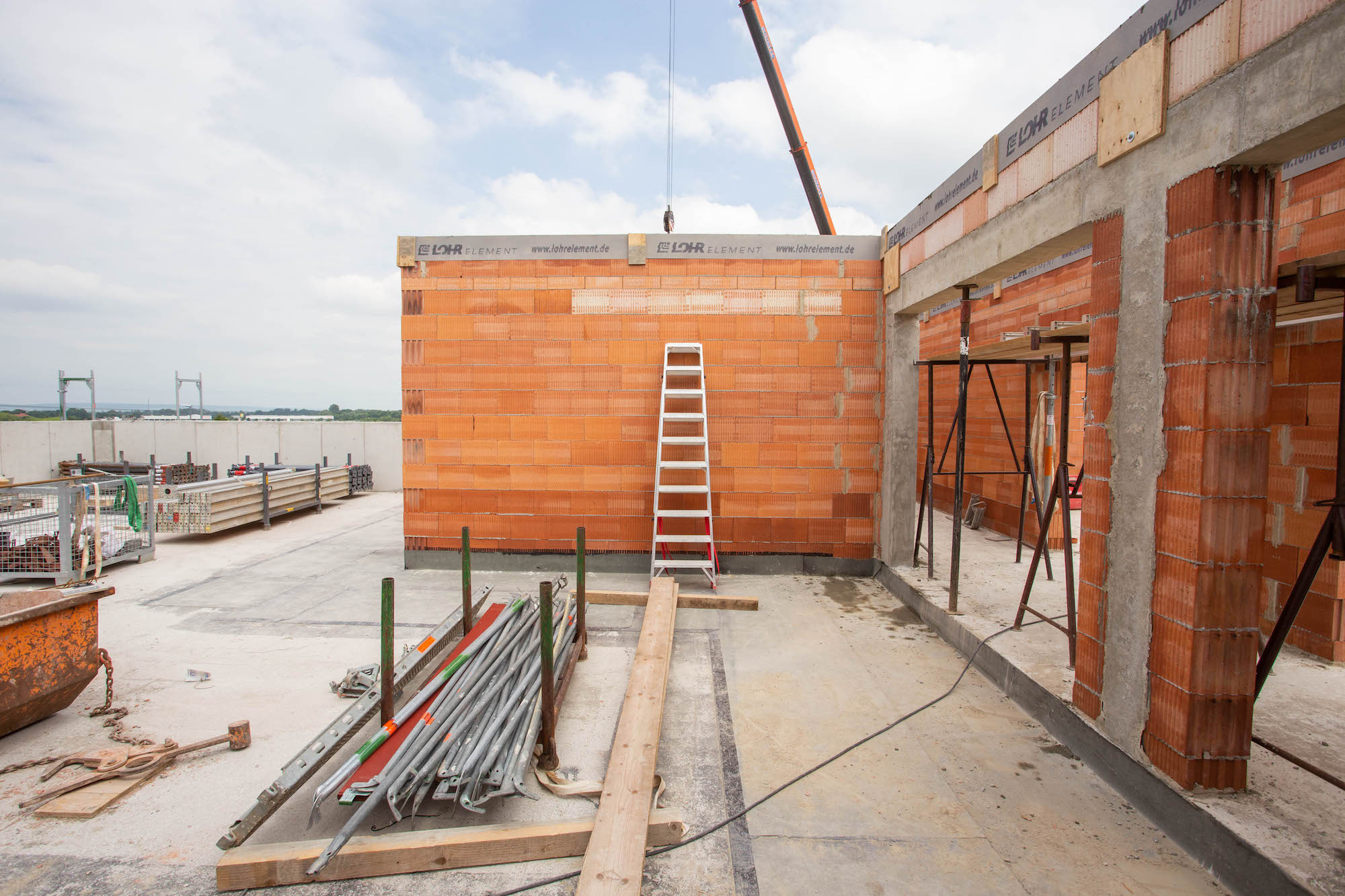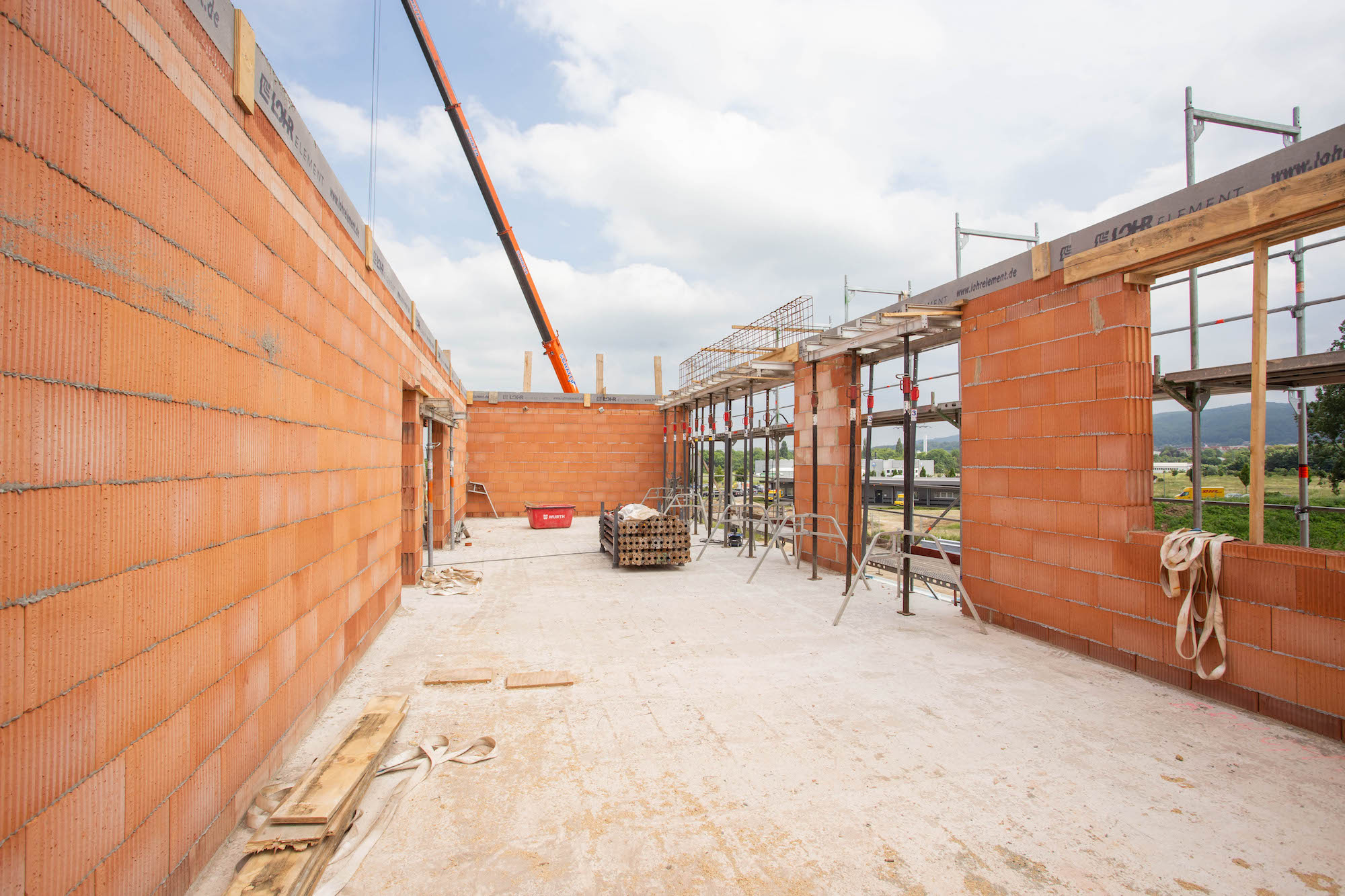 Auf der Baustelle waren auch schnell Fortschritte zu sehen. Nachdem die Bodenplatte für das neue und moderne Gebäude gegossen war, wurde die dazugehörige Halle vom Partner Bau Quedlinburg abgeschalt und das Mauerwerk gewann schnell an Höhe. Bei strahlendem Sonnenschein ging es Ende April dann an die Stützpfeiler im Erdgeschoss. Innerhalb weniger Wochen wurde dann bereits die erste Decke gezogen sowie eine Treppe zur Verbindung einzelner Geschosse errichtet. Mittlerweile wurden auch schon die Rohe für den Fernwärmeanschluss durch die Stadtwerke Wernigerode verlegt.