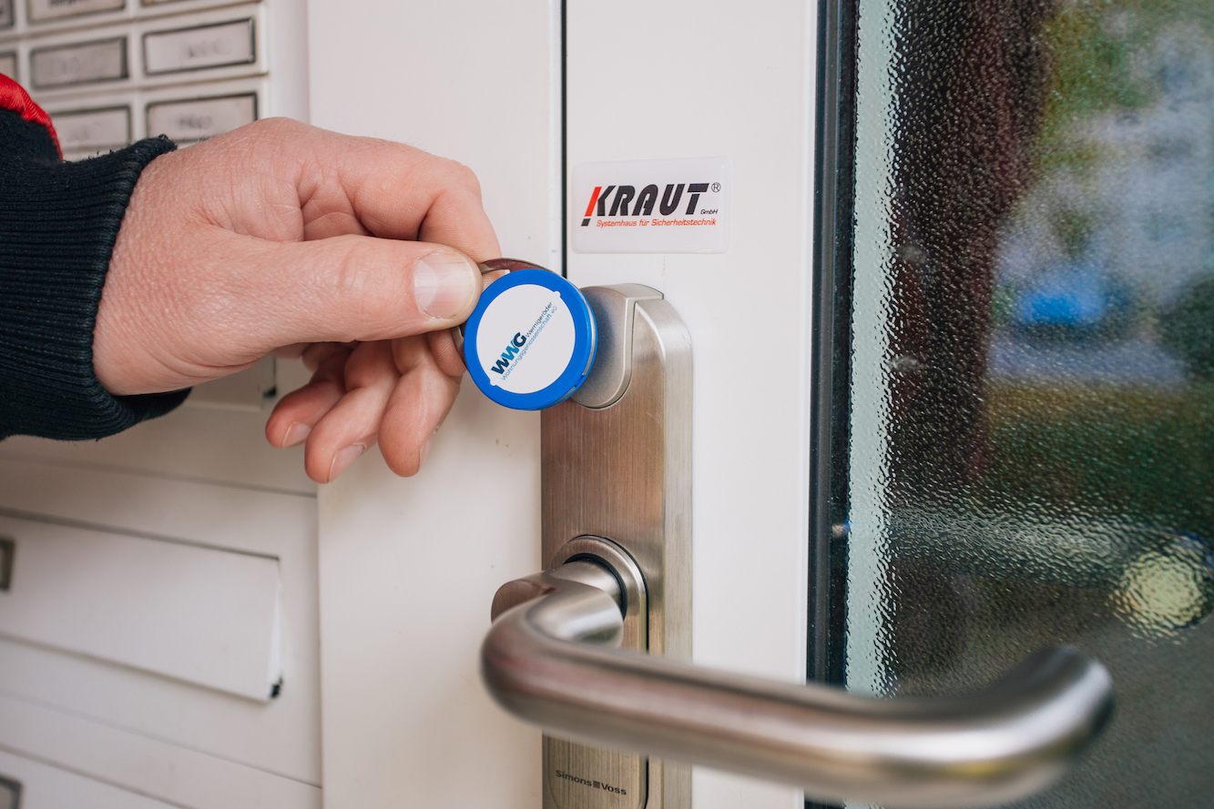 Mit Hilfe des kleinen Transponderchips hat für die Bewohner die lästige Schlüsselsuche nun ein Ende. Nicht nur die Vorder- und Hintereingänge wurden mit einem elektronischen Schloss ausgestattet, sondern auch die Kellertüren und Müllcontainer. Durch einfaches Anhalten des Chips oberhalb der Klinke lässt sich die Tür in Sekundenschnelle öffnen. Ein blaues Leuchtsignal und ein leiser Piepton signalisieren den Bewohnern, dass die Klinke gedrückt werden kann. Bei Verlust oder Umzug wird der Chip neu programmiert und die alten Daten somit gelöscht.