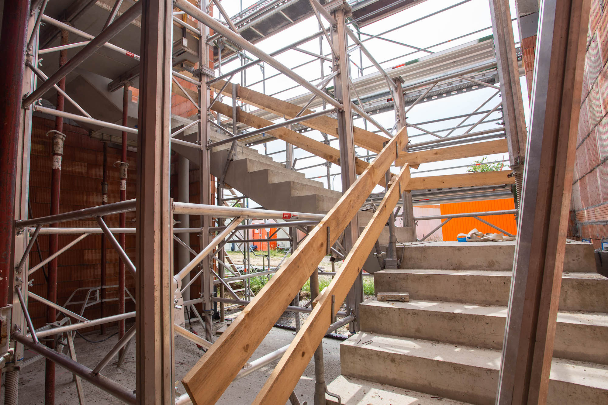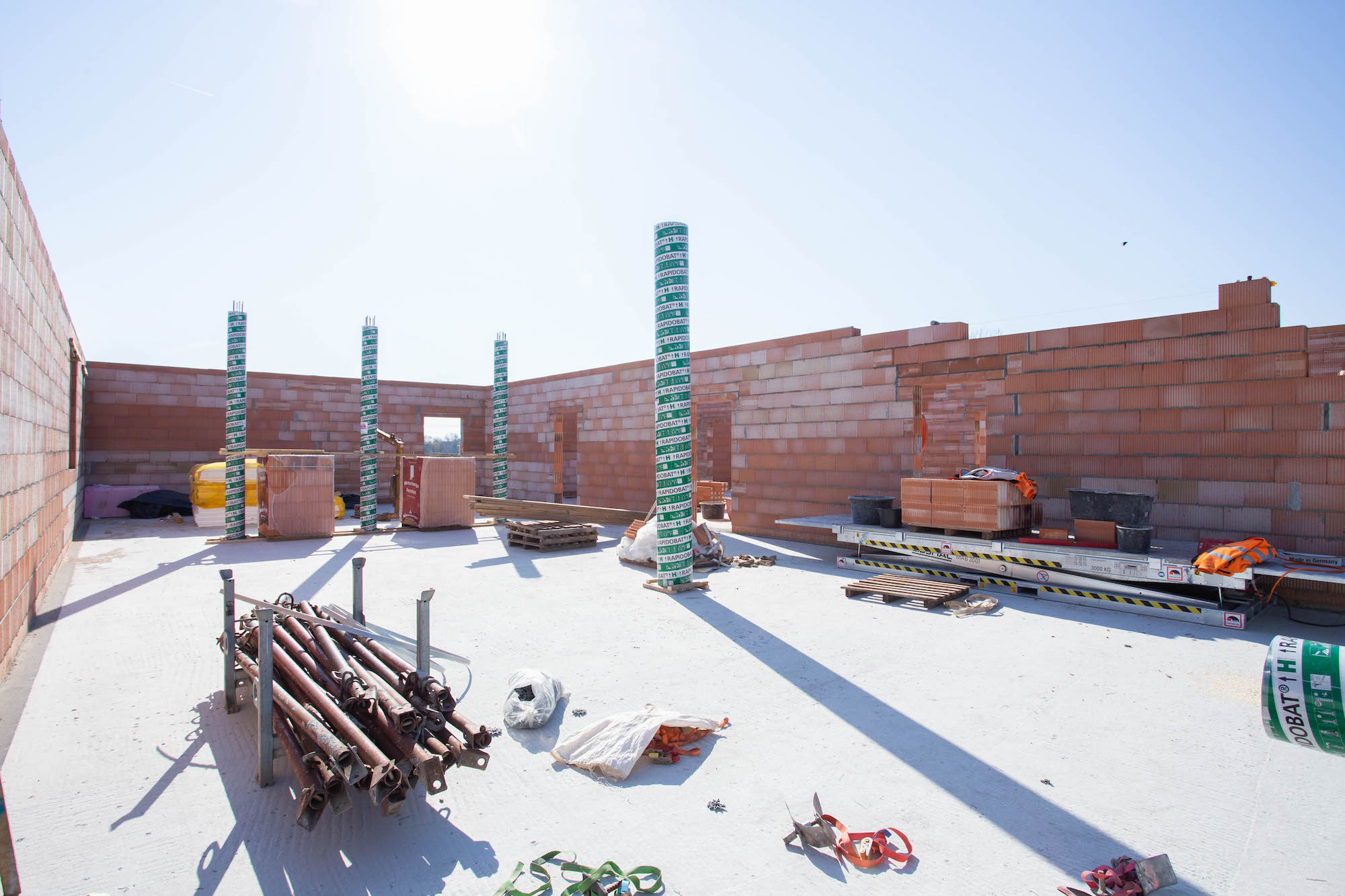 Auf der Baustelle waren auch schnell Fortschritte zu sehen. Nachdem die Bodenplatte für das neue und moderne Gebäude gegossen war, wurde die dazugehörige Halle vom Partner Bau Quedlinburg abgeschalt und das Mauerwerk gewann schnell an Höhe. Bei strahlendem Sonnenschein ging es Ende April dann an die Stützpfeiler im Erdgeschoss. Innerhalb weniger Wochen wurde dann bereits die erste Decke gezogen sowie eine Treppe zur Verbindung einzelner Geschosse errichtet. Mittlerweile wurden auch schon die Rohe für den Fernwärmeanschluss durch die Stadtwerke Wernigerode verlegt.