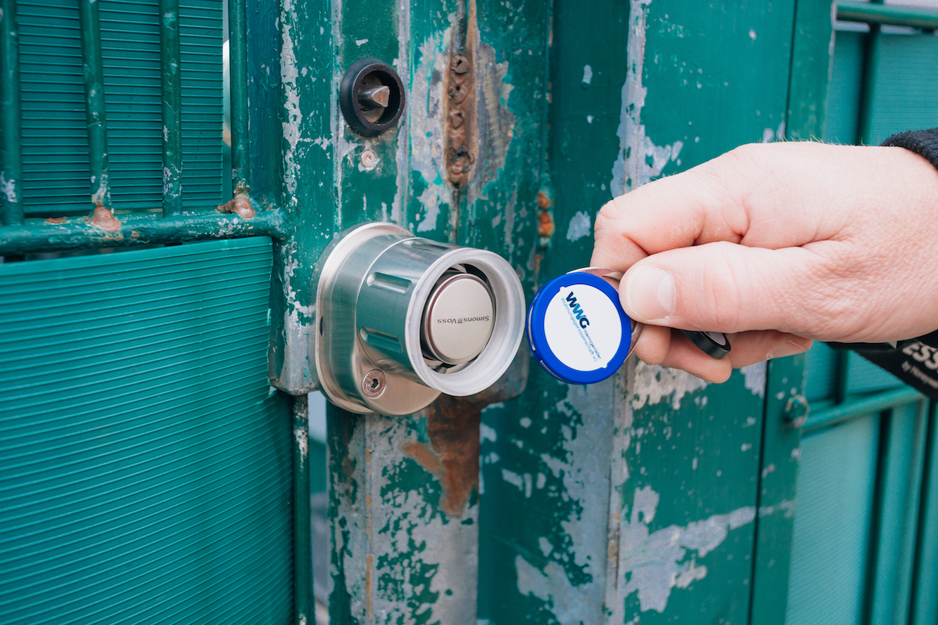 Mit Hilfe des kleinen Transponderchips hat für die Bewohner die lästige Schlüsselsuche nun ein Ende. Nicht nur die Vorder- und Hintereingänge wurden mit einem elektronischen Schloss ausgestattet, sondern auch die Kellertüren und Müllcontainer. Durch einfaches Anhalten des Chips oberhalb der Klinke lässt sich die Tür in Sekundenschnelle öffnen. Ein blaues Leuchtsignal und ein leiser Piepton signalisieren den Bewohnern, dass die Klinke gedrückt werden kann. Bei Verlust oder Umzug wird der Chip neu programmiert und die alten Daten somit gelöscht.